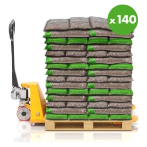 Palette de 140 sacs de pellets ENERVER (15 kg – 2100 kg) : granulés premium à haut rendement, combustion propre, faible taux de cendres. Idéal poêles et chaudières.